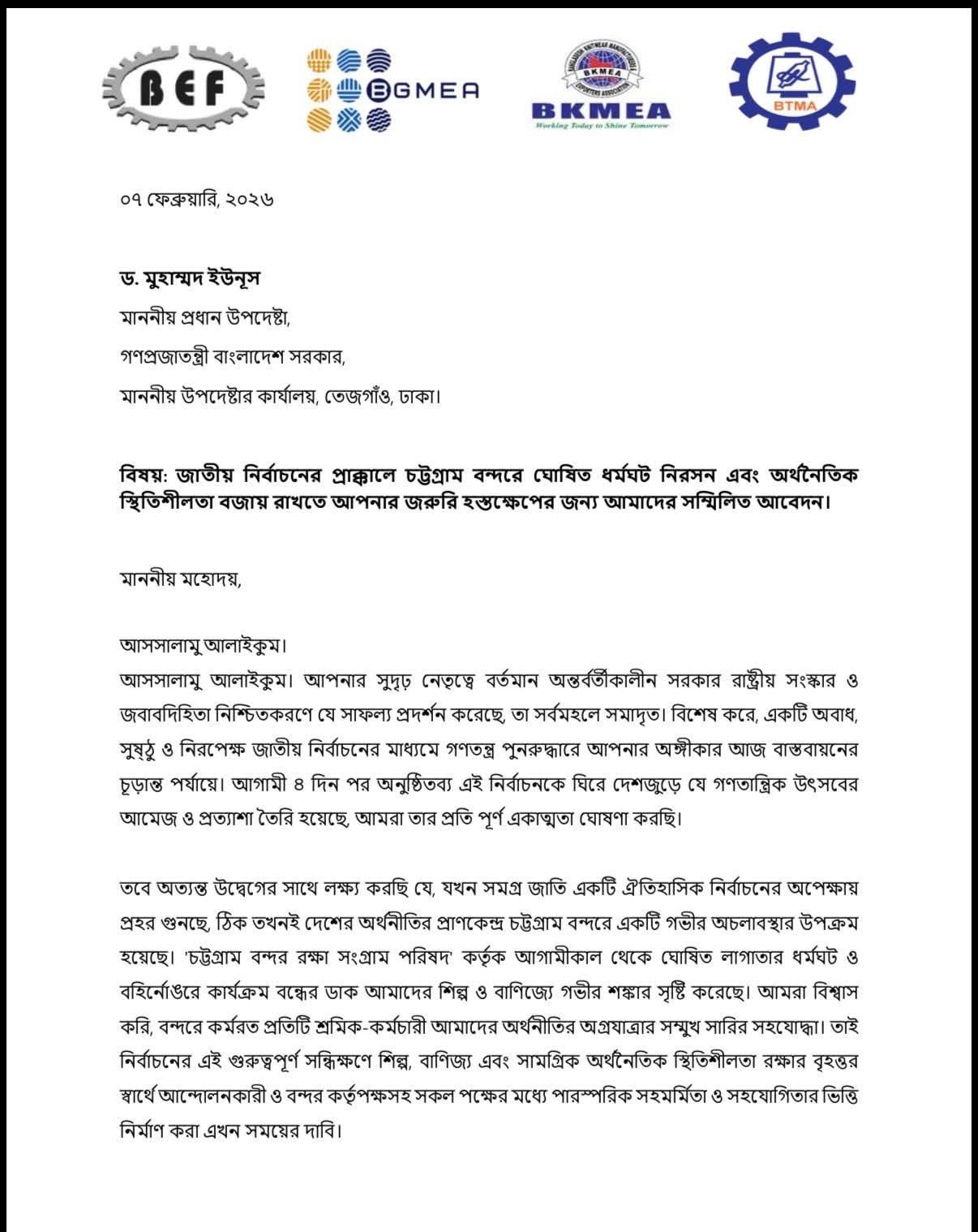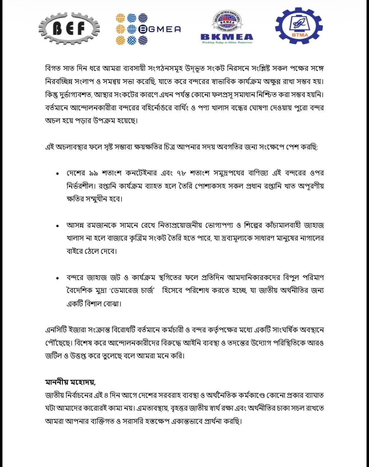 জাতীয় নির্বাচনের প্রাক্কালে চট্টগ্রাম বন্দরে ঘোষিত ধর্মঘট নিরসন এবং অর্থনৈতিক স্থিতিশীলতা বজায় রাখতে জরুরি হস্তক্ষেপ চেয়ে গণপ্রজাতন্ত্রী বাংলাদেশ সরকাররে প্রধান উপদেষ্টা ড. মুহাম্মদ ইউনূস কে খোলা চিঠি দিয়েছে ৪ ব্যবসায়ী শীর্ষ সংগঠন বাংলাদেশ এমপ্লয়ার্স ফেডারেশন (বিইএফ), বাংলাদেশ পোশাক প্রস্তুতকারক ও রপ্তানিকারক সমিতি (বিজিএমইএ),বাংলাদেশ নিটওয়্যার প্রস্তুতকারক ও রপ্তানিকারক সমিতি (বিকেএমইএ) এবং বাংলাদেশ টেক্সটাইলস মিলস অ্যাসোসিয়েশন (বিটিএমএ)