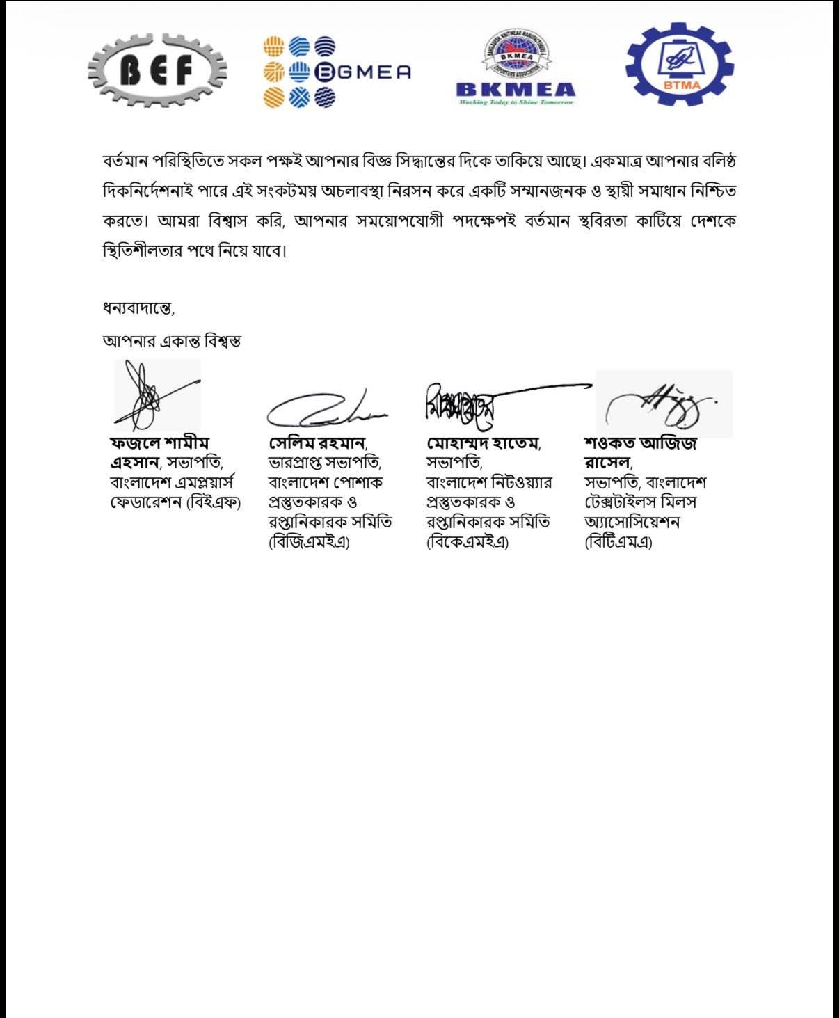 প্রধান উপদেষ্টা কে খোলা চিঠি ৪ ব্যবসায়ী শীর্ষ সংগঠনের