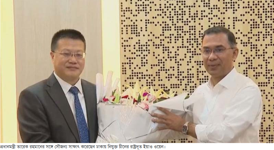 প্রধানমন্ত্রী তারেক রহমানের সঙ্গে সৌজন্য সাক্ষাৎ করেছেন ঢাকায় নিযুক্ত চীনের রাষ্ট্রদূত ইয়াও ওয়েন। আজ সোমবার (২৩ ফেব্রুয়ারি) সচিবালয়ে প্রধানমন্ত্রীর দপ্তরে এই উচ্চপর্যায়ের সাক্ষাৎ অনুষ্ঠিত হয়। বৈঠকে দুই দেশের দ্বিপাক্ষিক সম্পর্কের